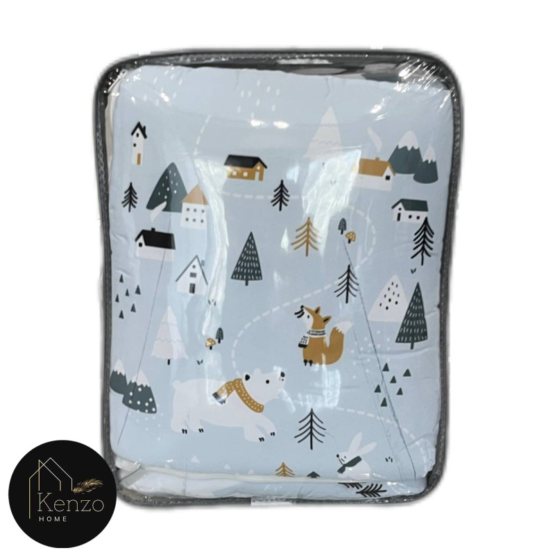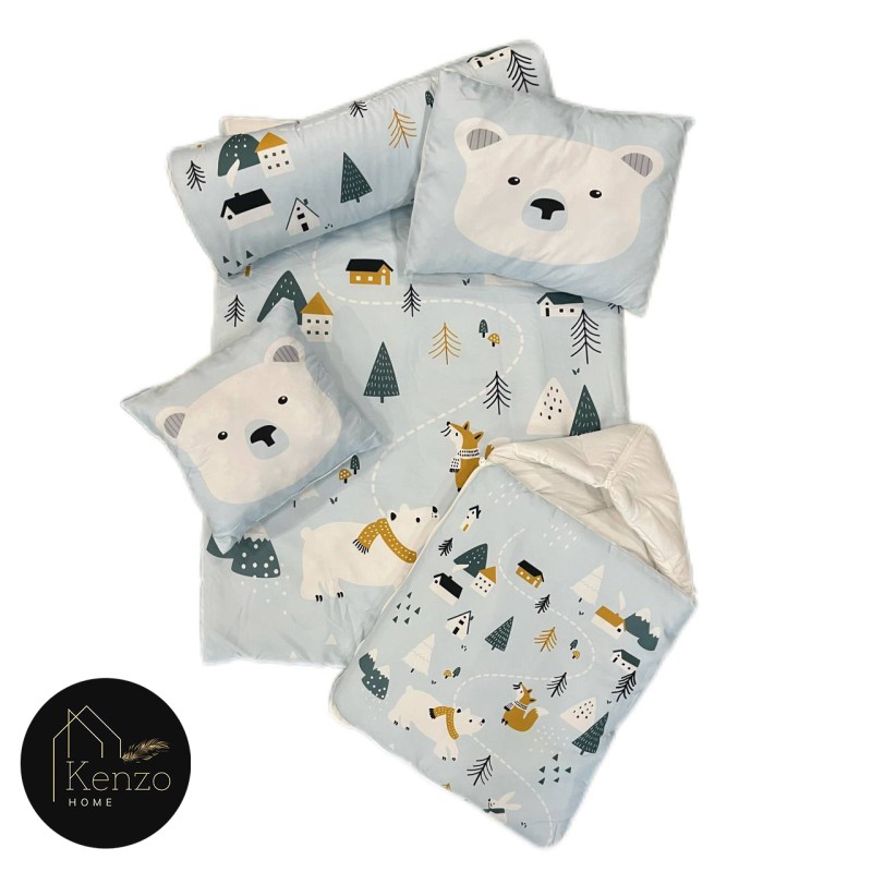 • لحاف ، تشک ، یک عدد بالش پر شده و قنداق از جنس پنبه و با کیفیت و نرم و به رنگ زمینه آبی روشن و با طرح چاپی خرس قطبی میباشد.